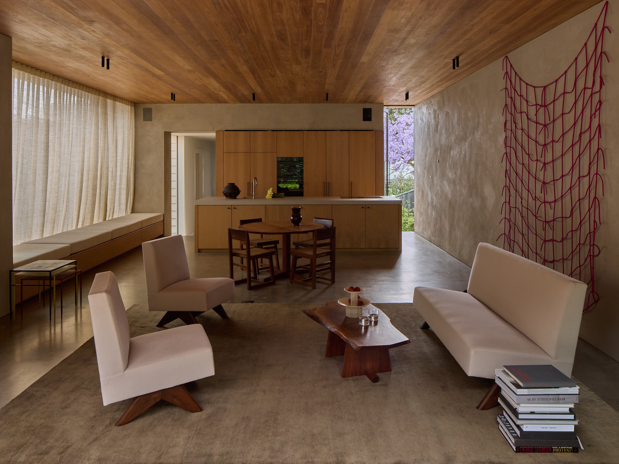 The design aims to feel open and inviting, with a large fireplace and expansive living, kitchen, and dining spaces. The home functions as a canvas for the furniture and art it houses, providing a stage for the individuals who occupy it. Large glazing opens the interior to the surrounding garden, connecting both spaces through a material continuity in the ceiling and soffit timbers, as well as mono-material internal and external walls.